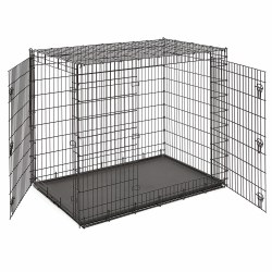Durable heavy duty metal dog crate design w/ 3 heavy duty secure slide-bolt latches per door. Please note this is an extra extra-large dog crate and requires 2 people for assembly. Pan Stop Allows Pan To Be Removed With Doors Closed